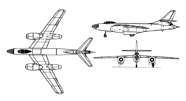 Engine: 2 x Rolls-Royce Nene I turbojets, 5000-lb (2272-kg) Max take-off weight: 15720 kg / 34657 lb Empty weight: 8993 kg / 19826 lb Wingspan: 18.86 m / 62 ft 11 in Length: 15.75 m / 52 ft 8 in Height: 4.19 m / 14 ft 9 in Wing area: 48.8 sq.m / 525.28 sq ft Max. speed: 783 km/h / 487 mph Ceiling: 11360 m / 37250 ft Range: 2200 km / 1367 miles Crew: 4
