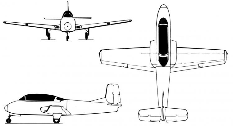 The major differences are a new design of the rear fuselage and the elevation of the stabilizer to clear the engine nozzle. The engine selected was a Continental YT69 T-9 (Marbore II built under license) of 417 Kp thrust.