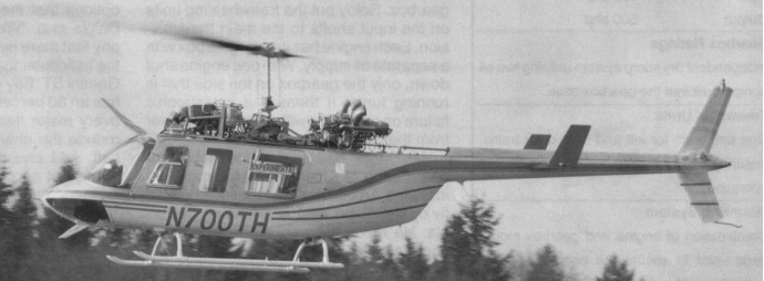 After Doug Daigle rappelled out of the helicopter to see what the fire crew would experience (an act he regrets to this day), he concluded that if the engine failed while the crew was rappelling, they would prob¬ably die. Even using a 212, the crew on the rope would be severely injured or killed. The 212 might be able to recover, but the team on the rope would be dragged through the trees or rocks. Mr Daigle then decided to try to design a twin engine conversion for the Bell LongRanger. While several people, includ¬ing from Bell Helicopter, had the same idea in the past, he took a different approach in wanting to design a helicopter that would take off on one engine at sea level at gross weight. The Bell TwinRanger project in¬volved a complete redesign that would weigh almost 1,500 lb more than the LongRanger, weight that caused the project to be shelved.