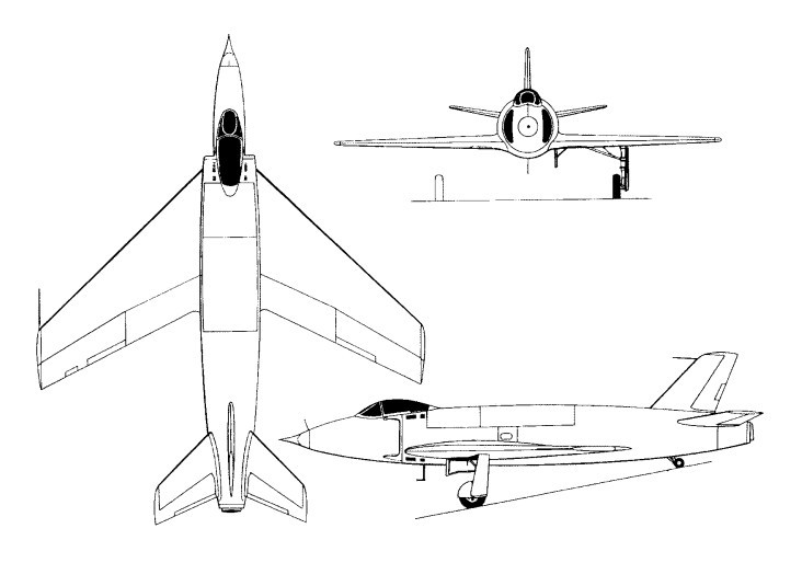 Responding to Admiralty interest in “undercarriage-less” aircraft suitable for operation from flexible decks on aircraft carriers, Supermarine designed the Type 505 single-seat fighter in 1945. Two Rolls-Royce AJ65 (later to be named Avon) turbojets were located side-by-side in a broad centre fuselage to provide a stable base for alighting on the “carpet” and a Vee configuration kept the tail surfaces clear of the jet efflux. An armament of twin 20mm cannon was planned and provision was made to provide for a fixed tricycle undercarriage for flight development and operation from shore bases. It was thus relatively simple to incorporate a retractable undercarriage in the design when Admiralty interest in the flexible deck concept waned in late 1947 and the fighter was modified as the more conventional Type 508.