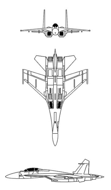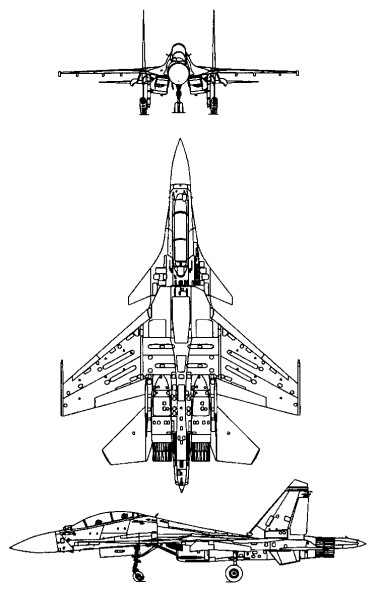 Su-27M/ Su-35 upgraded airframe with canards, digital FBW, bigger radome and sting, ` higher vertical fins, 14 hardpoints, retractable air refueling probe, internal fuel 10250 kg, can carry 2 drop tanks each 2000 l, upgraded avionics, radar N011, rear looking radar N012 in sting, full A-G capability, glass cocpit (3 –4 monochrome MFDs) Powerplant: 2x AL-31FM Thrust – afterburner: 142 kN Overall length: 22.18 m Wing span: 14.7 m Wing area: 62.04 sq.m Height: 6.43 m Empty weight: 18,400 kg Normal take-off weight: 25,700 kg Internal fuel: 10,250 kg / 13,055 lt Max warload: 8,000 kg Max speed high altitude: 2,500 km/h Max speed sea level: 1,400 km/h Max Mach number: 2.35 Service ceiling: 18,000 m Max G load: 9 Range high altitude: 3,200 km Range sea level: 1,450 km Range with one IFR: 6,500 km Take-off run: 750 m Landing roll: 600 m Crew: 2