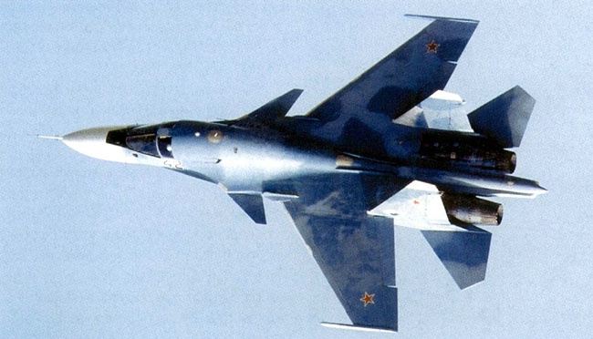 Su-27IB/ Su-32/ Su-34 / T-10B completely changed airframe, seats side by side, canards, bigger sting, flat radome, main undercarriage with two tandem wheels, 12 hardpoints, ESA radar B004, rear looking radar N012 in sting, new navigation sys., internal fuel 12 100 kg, max G limit 7G, can carry 3 drop fuel tanks each with 3000 l/ 2400 kg fuel, titan armour used on cockpit, some fuel tanks and partialy engines of weight 1480 kg, fixed geometry air intakes, without air brake, without ventral fins, retractable air refueling probe, added some stealth features and RAM, digital FBW, together 6 prototypes were built (2 used only for ground tests) Powerplant: 2x Lyulka AL-31F afterburning turbofans Thrust – afterburner: 122.58 kN / 12,500 kgf / 27,577 lb st Thrust – max dry: 7,770 kgf Overall length: 23.34 m / 76 ft 6.5 in Wing span: 14.7 m / 48 ft 3 in Wing area: 62.04 sq.m Height: 6.36 / 6.09 m Empty weight: 22,500 kg Normal take-off weight: 38,240 kg Max take-off weight: 45000 kg / 99209 lb Internal fuel: 12,100 kg / 15,400 lt Max warload: 8,000 kg / 17,637 lb Hardpoints: 12 Max speed high altitude: 1,900 km/h / 1181 mph / Mach 1.8 Max speed sea level: 1,400 km/h / 870 mph Max Mach number: 1.8 Service ceiling: 15,000 m / 49200 ft Max G load: 7 / 9 Range high altitude: 4,000 km / 2486 miles Range with one IFR: 7,000 km Take-off run: 1,260 m Landing roll: 950 m Armament: one GSh-301 30mm cannon with 180 rounds Crew: 2