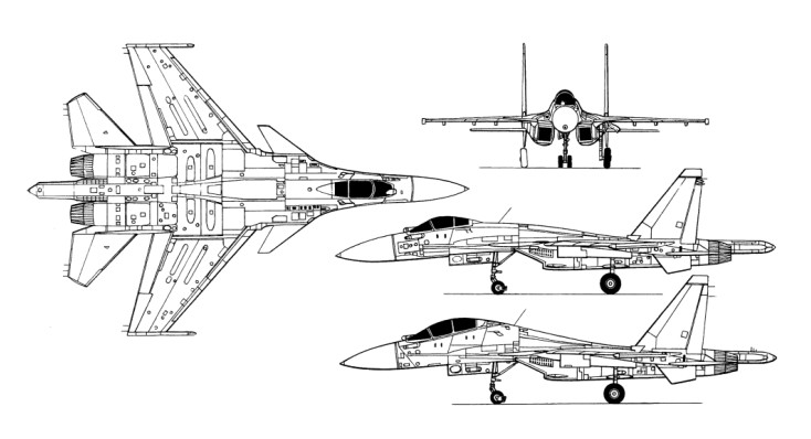Su-27PU/Su-30 retractable air refueling probe, modified radar radar N001 (can attack 2 targets with R-27 simultaneously), upgraded navigation system, datalink APD-518, tactical displey SEI-31 in rear cockpit, rear seat position as mission commander for formations of single seat Su-27P/S, actually are upgraded on standard Su-30KN Powerplant: 2x Saturn Lyul’ka AL-31F afterburning turbofans Thrust – afterburner: 122.58 kN / 12,500 kgf Thrust – max dry: 7,770 kgf Overall length: 21.935 m / 72 ft 9 in Wing span: 14.7 m / 48 ft Wing area: 62.04 sq.m Height: 6.357 m / 21 ft 5 in Max Take-Off Weight 33000 kg / 72,752 lb Empty weight: 17,700 kg / 39,021 lb Internal fuel: 9,400 kg / 11,975 lt Max warload: 8,000 kg / 17,637 lb Hardpoints: 8 Armament: one GSh-301 30mm cannon 150 rounds Max speed high altitude: 2,125 km/h / 1,320 mph Max speed sea level: 1,400 km/h / 870 mph Max Mach number: 2.0 Service ceiling: 17,500 m / 57,410 ft Max G load: 9 Range high altitude: 3,000 km Range sea level: 1,300 km Range with one IFR: 5,200 km Take-off run: 750 m Landing roll: 650 m Crew: 2