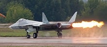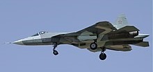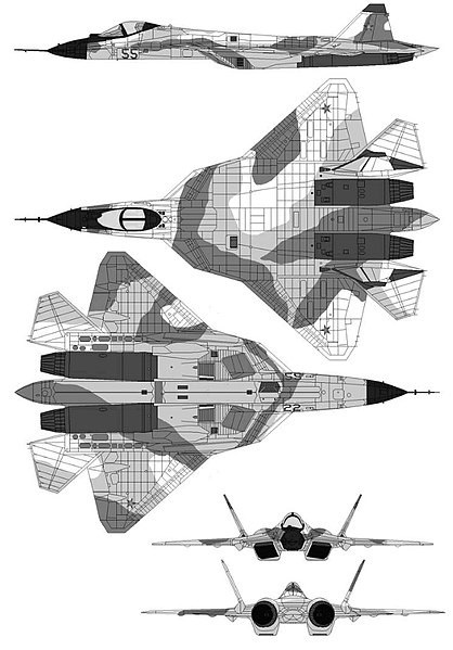 T-50 Engines: 2 × Saturn AL-41F1 (initial production) turbofans with thrust vectoring, 93.1 kN (20,900 lbf) thrust each dry, 147.2 kN (33,100 lbf) with afterburner 2 × izdeliye 30 (later production) turbofans with thrust vectoring, 107.9 kN (24,300 lbf) thrust each dry, 176.6 kN (39,700 lbf) with afterburner Wingspan: 13.95 m (45 ft 9 in) Length: 19.8 m (65 ft 0 in) Height: 4.74 m (15 ft 7 in) Wing area: 78.8 sq.m (848 sq ft) Empty weight: 18,000 kg (39,683 lb) Typical mission weight, 29,270 kg (64,530 lb) at full load Max takeoff weight: 35,000 kg (77,162 lb) Fuel capacity: 10,300 kg (22,700 lb) internally Maximum speed: Mach 2 (2,120 km/h; 1,320 mph) at altitude Supercruise: Mach 1.6 (1,710 km/h; 1,060 mph) at altitude Range: 3,500 km (2,200 mi, 1,900 nmi) subsonic, 4,500 km from 2 outboard fuel tanks Supersonic range: 1,500 km (930 mi, 810 nmi) Service ceiling: 20,000 m (66,000 ft) g limits: +9.0 Wing loading: 317 kg/sq.m (65 lb/sq ft) typical mission weight Thrust/weight: AL-41F1: 1.02 (1.19 at typical mission weight) izdeliye 30: 1.15 – 1.2 (1.36 at typical mission weight) Guns: 1 × 30 mm Gryazev-Shipunov GSh-30-1 autocannon in right LEVCON root Hardpoints: 12 hardpoints (6 × internal, 6 × external) Crew: 1