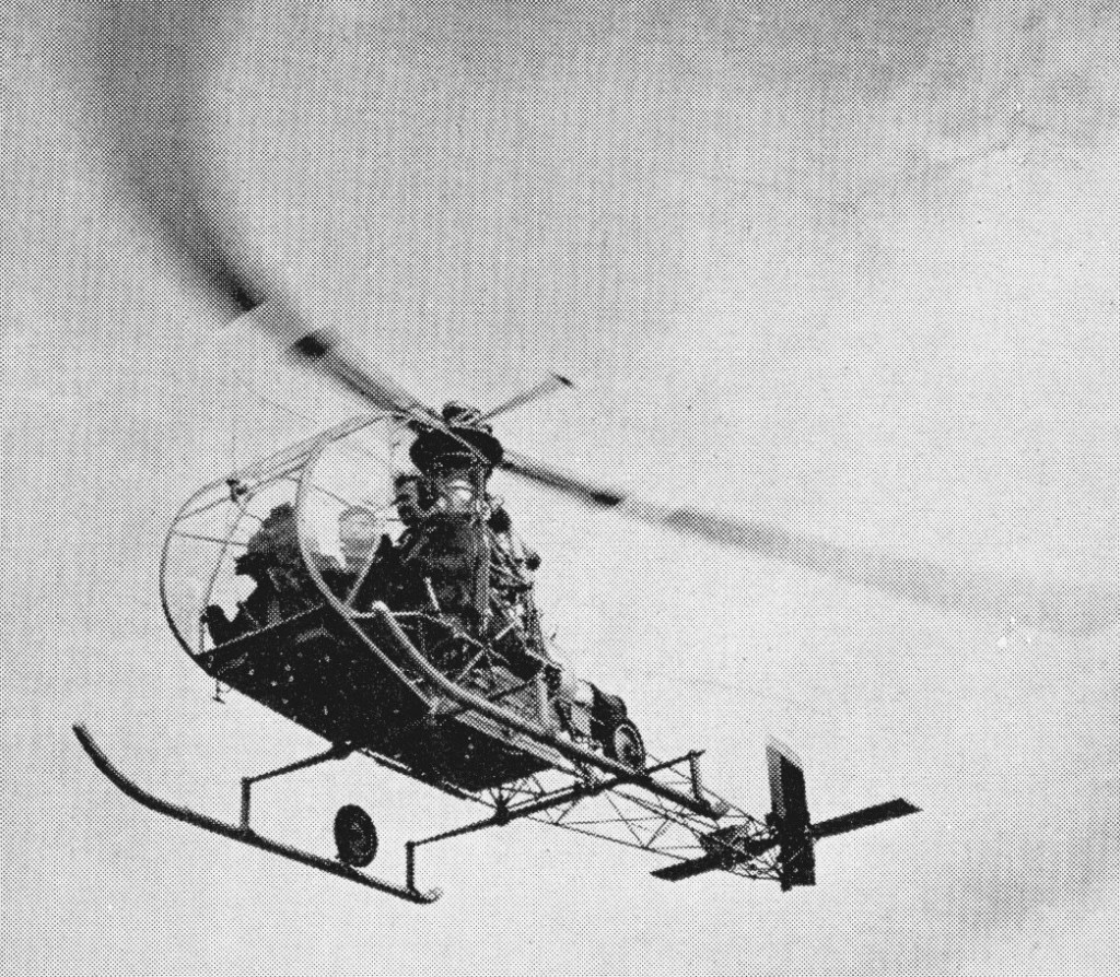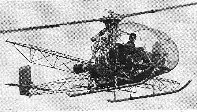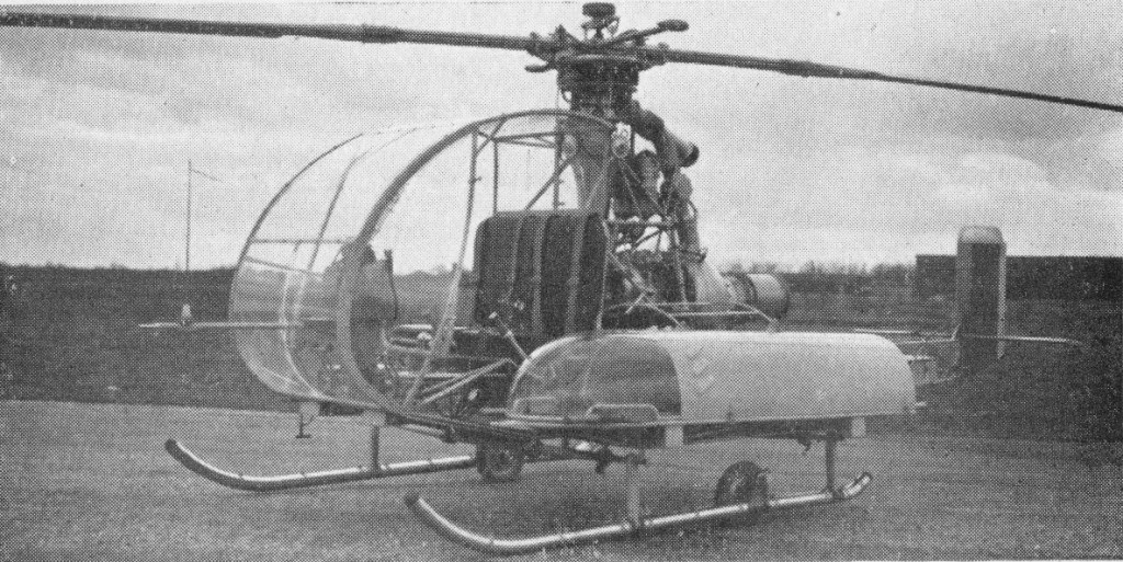 The experience acquired by Sud-Ouest in building its two prototypes of the Ariel led to the SO.1221 Djinn. The Djinn’s began with two single-seat SO.1220 prototypes, F-WGVO and F-WGZX, the first of which made its maiden flight on 2 January 1953. A simple uncovered structure of welded steel tube carrying a two-blade rotor above it, and with a single exposed seat for its pilot. Its powerplant was a Turbomeca Palouste turbo-compressor producing a large volume of compressed air which, using a similar distribution method to that of the Ariel, was discharged at the blade tips. These were both intended primarily to prove the rotor and propulsion systems.