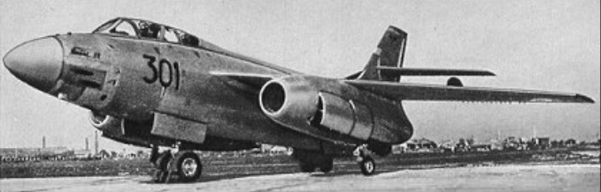Engines: 2 x Rolls-Royce Nene 102 turbojets, 4,980 lb st (2 260 kgp) Fuel cap: 1430 ImpGal (6500 lt) Wing span: 58 ft 7 1/8 in (17,86 m) Length: 64 ft 9½ in (19,75 m) Wing area of 807.32 sq ft (75,00 sq.m) Empty wt: 36,5581b(16 583 kg) Loaded wt: 48,510 lb(22 005kg) Estimated performance – Max speed of 528 mph (850 km/h) at 29,530 ft (9 000 m) or Mach 0.78 and 515 mph (830 km/h) at sea level or Mach 0.675.