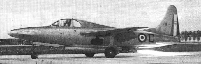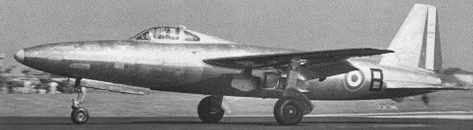 Engine: Rolls-Royce Derwent V turbojet, 3,000 lb st (1360 kgp) Span: 3l ft 2 in (9,50m) Length of 32 ft 5.75 in (9,90 m) Wing area: 193.76 sq ft (18,00 sq.m) Empty wt: 8,466 lb (3 840 kg) Loaded wt: 10,362 lb (4 700 kg)