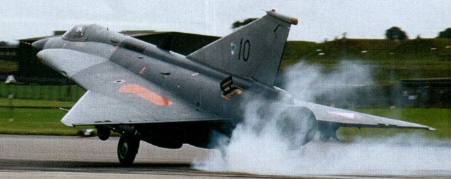 Prolonged research led to adoption of a then-unique canard configuration for the interceptor that was to form the airborne component of the weapon system. The configuration comprises a large rear-mounted delta wing combined with a delta foreplane incorporating trailing-edge flaps. This was adopted to provide improved STOL performance so that the Saab-37 would be able to operate from short runways and sections of roadway about 500m in length, greatly increasing the flexibility of dispersed operations. This configuration, in combination with a high-power turbofan engine, has provided the essential short take-off capability. The engine also complements short landing capability by introducing thrust reversal, its first use in a combat aircraft. The Saab-37 has been designed for a ‘no-flare’ approach to landing with a rate of sink of 5m per second, and this has meant the design of special landing gear able to absorb such a high rate of descent. Once on the ground, thrust reversal plus anti-skid brakes ensure the achievement of a minimum landing run. The pilot is accommodated on a zero-zero ejection seat in an air-conditioned, heated and pressurised cockpit, protected by a bird-proof windscreen. Much of the capability of this aircraft results from the incorporation of the latest avionics, including for attack a head-up display linked via an air-data computer to a digital fire-control system; for its own protection ECM (electronic countermeasures) and radar warning equipment; for navigating Doppler radar and radar altimeter; and for landing in all weathers a tactical instrument landing system plus a blind-landing guidance system.