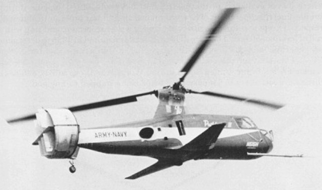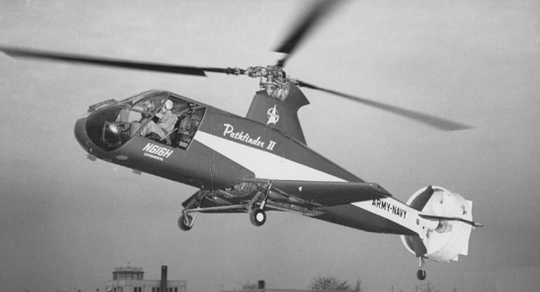 The Piasecki Aircraft Corporation has been engaged since the early 1960s on a series of compound helicopter research designs known by the name Pathfinder. The concept first took material form at the Model 16H-1 Pathfinder prototype (registration N616H). This aircraft was developed as a private venture and flew for the first time on 21 February 1962, undertaking this flight as a ‘pure’ helicopter without using the 3-blade ducted tail fan. No wings were fitted at that stage, the cabin was unfaired, and the retractable landing gear was fixed in the extended position. Small stub-wings, which could be folded, and a fully-enclosed cabin to accommodate a pilot and 4 passengers, were added later in the year. The Pathfinder also mounted a retractable landing gear.
