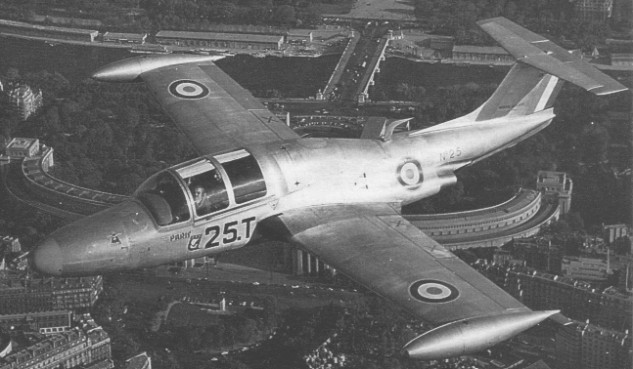 The Turboméca Mabore II powered first prototype, MS.760-01 F WGVO (then F-BGVO), was flown on 29 July 1954, and interest shown by the French military authorities resulted in orders for 50 for the air force and navy on 18 July 1956, the initial production example designated M.S.760A, flying on 27 February 1958. Fitted with tip tanks, this type was delivered as the Paris IR to the Armée de l’Air and the Aeronavale.