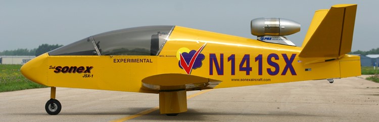 The SubSonex jet aircraft prototype, JSX-1, made its first flight on August 10, 2011 at Wittman Airport in Oshkosh, Wisconsin. Piloted by Bob Carlton, the flight lasted approximately 14 minutes and focused on low-end speed, including stalls and low approaches in the landing configuration. The engine selected for the SubSonex is the Czech-built PBS TJ-100 turbojet.