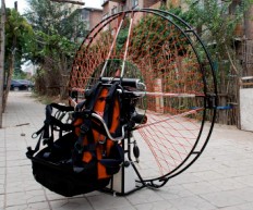 A 150cc Paramotor. 2-stroke, and water-cooled, with electric start for paragliders.