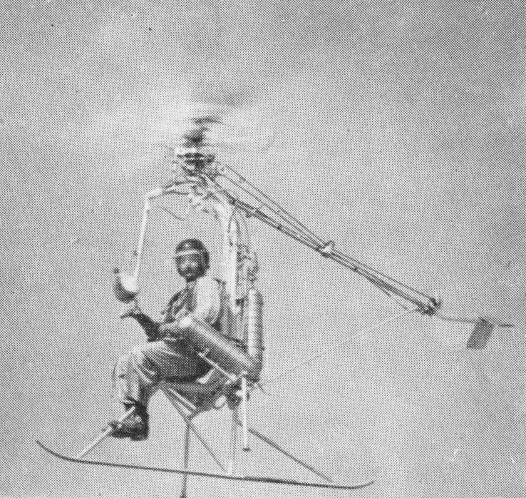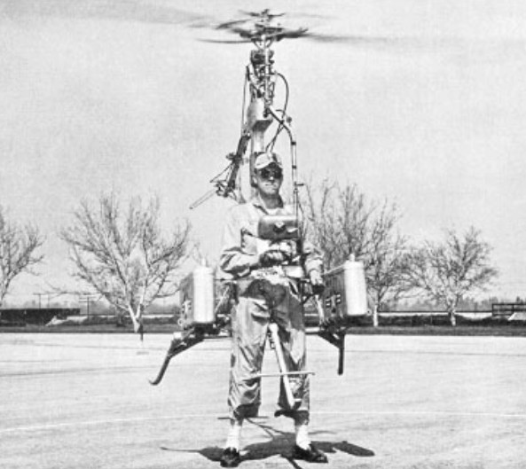 Little more heard of Gilbert Magill until the mid-1950s, when the RH-1 Pinwheel ‘strap-on’ personal helicopter appeared in 1954. The Rotorcraft RF-1 Pinwheel one-man helicopter was designed in 1954 to provide military personnel with a simple go-anywhere vehicle. Basically a strap-on device, it relied upon liquid propellants to power a tipjet at the end of each rotor blade, there thus being no rotor torque effect. The Pinwheel had a ‘quadripod’ frame layout, with the pilot sitting in the centre of the structure with a pair of liquid nitrogen tanks positioned behind him to feed Reaction Motors XLR-32RM rocket motors mounted at the rotor tips. A belt-driven rail rotor was incorporated in the simple and limited structure to provide steering capability.