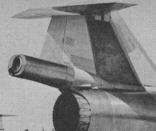 The Rocketdyne AR-2 is fitted above and aft of the J79 engine in the Lockheed NF-104A. To attain a 25 mile altitude the 6000 lb thrust engine burns a mixture of JP-4 jet fuel and hydrogen peroxide.