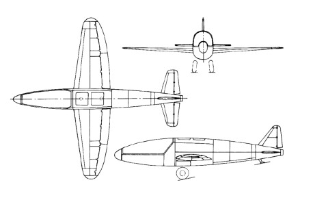 The chief designer was S.P.Korolev and his deputy was E.S.Schetinkov. The original design was a single-seater and a pressurised cabin was not in consideration, instead the pilot was provided with a space suit. The empty aircraft was to be very light: 240kg airframe, 200kg fuel system, 200kg compressed air system (used for life support and to displace fuel components toward the engine), 50kg for engine. The rocket engine should have thrust of 19.6kN and the take-off should be assisted by solid fuel boosters. After a steep climb (at angle of 60°) to an altitude 32km, and the aircraft would glide at the speed of up to 2500km/h, covering 220km in 18min.