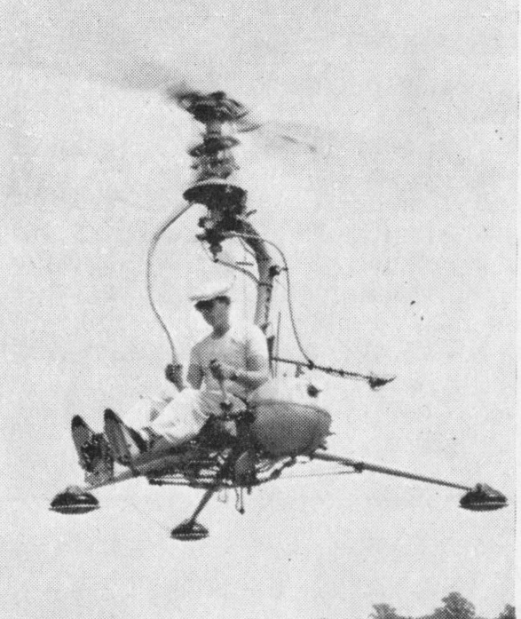 Nicknamed ‘Stable Mable’, the KH-15 has been built for the U.S. Navy to test a new system oft gyro-abilisng cotrols. It flew after only 8 minutes of tethered tests. Power units are tip-mounted hydrogen peroxide rocket motors.