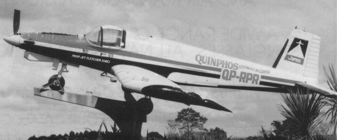 The conversion of a standard Fletch¬er to take a PT-6A-20 turbine of 500 shp was designed by Dennis Kemp of Air New Zealand for a James Aviation/Thames Aerial Topdressing/Robertson Air Service consortium. Development work began at Air NZ’s jet base at Mangere in 1966 and entailed considerable structural rede¬sign of the Fletcher’s nose section, a 12-inch fuselage stretch, two feet increase in wingspan, strengthened wing and rear fuselage, including vertical fin, a redesigned hop¬per – enabling it to take 24 cwt of super – and a dual main undercarriage. Technical substantiation was carried out by Air New Zealand and the model was type certificated by the CAA.