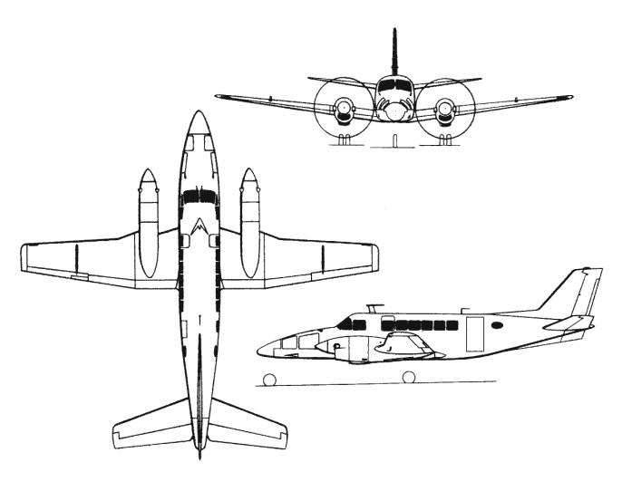 B90 Engines two 500-shp Pratt & Whitney turboprops. Seats 6-10. Gross Wt. 9650 lbs. Empty Wt. 5685 lbs. Fuel capacity 384 USG. Cruise 260 mph. Stall 87 mph. Initial climb rate 1900 fpm. Ceiling 27,000 ft. Range 1480 sm. Takeoff distance (50’) 1420 ft. Landing distance (50’) 2300 ft.
