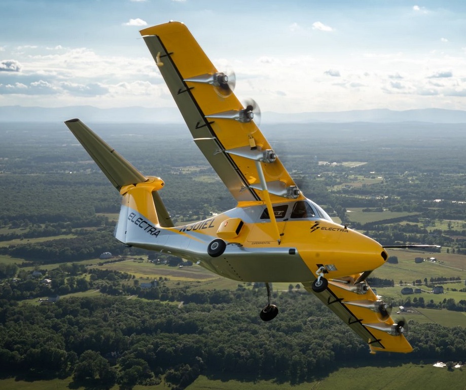 The eight small-diameter, five-bladed propellers along its wing run on quiet electric motors, fed by a big enough lithium battery pack to allow fully-electric takeoff and landing, and quiet flight over populated areas. Electra promises just 75 decibels at a distance of 300 ft (91 m).