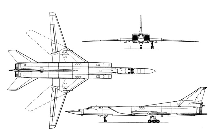 Tu-22M Engines: 2 x afterburning turbo-jet NK-25, 245.1kN Max take-off weight: 124000 kg / 273375 lb Wingspan: 23.3-34.3 m / 76 ft 5 in-113 ft 6 in Length: 42.5 m / 139 ft 5 in Height: 11.1 m / 36 ft 5 in Wing area: 165.0 sq.m / 1776.04 sq ft Max. speed: 2300 km/h / 1429 mph Ceiling: 14000 m / 45950 ft Range: 5100 km / 3169 miles Armament: 1-2 x 23mm cannons Bombload: 24000kg Crew: 4