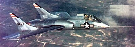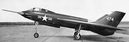 The Vought F7U Cutlass swept flying wing design had a large central nacelle and two substantial vertical tail surfaces. The first U.S. fighter designed from the start to use afterburners. Three prototype XF7U-1 (122472-122474) were built. The first flying on 29 September 1948.