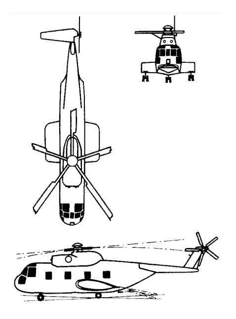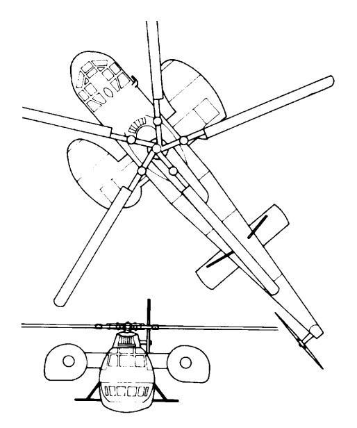 Engines: 2x 1,900 h.p. Pratt & Whitney R-2800-50 Rotors: 5-blade Main; 4-blade tail. Rotor diameter: 90 ft. Weight: 28,500 lb. Max. speed: over 150 m.p.h. Range: 200 miles at 120 m.p.h. Seats: 2 crew and 26 passengers.