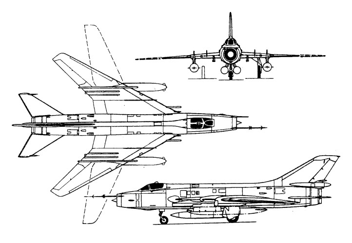 Whereas the Fitter B had been a straightforward adaptation of the Fitter A airframe, the Fitter C took the process of incremental design development a stage further. The wing remained basically similar to that of the v g prototype but was now mated with a derivative engine of the original AL 7F series turbojets. This, the similarly dimensioned AL 21F, offered a respectable increase in power and a modest improvement in SFC. A nominal increase in internal fuel capacity was acquired by adopting the deeper fuel housing dorsal spine that had been introduced by the two seat Su 7U as a means of compensating for some of the ill afforded loss in tankage that had inevitably accompanied the introduction of a second seat in a dimensionally barely lengthened (by 12 in/30cm) fuselage.