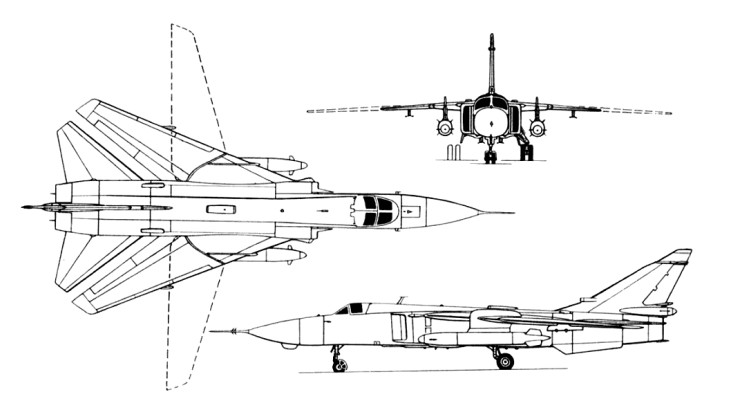 Su-24M (Fencer-D) Powerplant: two 109.8 kN (24,690 lb st) Saturn/Lyulka AL-21F-3A afterburning turbofans Length 24.59m (80 ft 8.25 in) Height 6.19m (20 ft 3.75 in) Wing span fully swept 10.36m (34 ft 0 in) Wingspan fully spread 17.64m (57 ft 10.5 in) Wing area: 51.0-55.2 sq.m / 548.96594.17 sq ft Take-off (‘clean’) 19.000 kg (41,885 lb) Max Take-Off Weight 39,700 kg (87,520 lb) Max level speed at 11,000m (36,090 ft) Mach 2.2 / 2.320 km/h / 1,441 mph Ceiling 17,500m (57,415 ft) Range w/max.fuel: 2500 km / 1553 miles Range w/max.payload: 560 km / 348 miles Armament: one 23 mm GSh-6-23 six barrel gun or one 30 mm GSh-6N-30 six barrel cannon in later versions Bombload: 8000 kg (17,637 lb) Hardpoints: 8 Crew: 2