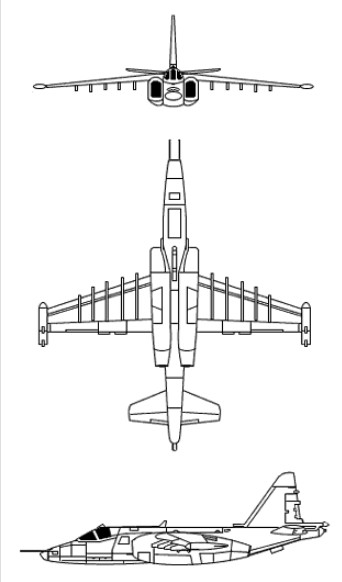 Su-25 ‘Frogfoot’ Engine: 2 x Tumansky R-13 Installed thrust (dry): 83 kN Empty wt: 9500 kg MTOW: 19,200 kg Wingspan: 15.50 m (50 ft 10 in) Length 14.50 m (47 ft 6 in) Wing area: 34 sq.m Fuel internal: 5000 lt. Air refuel: No Armament: one multi-barrel cannon beneath the centre fuselage 10 hardpoints for some 4000 kg (8,818 lb)