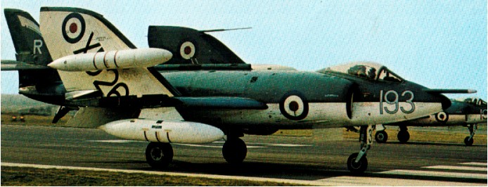 The Scimitar has mid-set sweptback wings, with slight anhedral, and dog-tooth leading edges. Blown trailing edge flaps are fitted. There are swept back tail surfaces with 10 degrees of anhedral on the tailplane. Conventional ailerons, rudder and one-piece all-moving tailplane are fitted. Engine air intakes are on each side of the fuselage by the cockpit. A tricycle undercarriage has single wheels on each unit, the mains retracting into the fuselage and the nosewheel retracts rearward. Internal tanks can be supplemented by four underwing tanks of up to 800 Imp.Gal total capacity. A flight refuelling probe can be fitted on the starboard side of the nose. The original armament was four 30mm Aden guns.