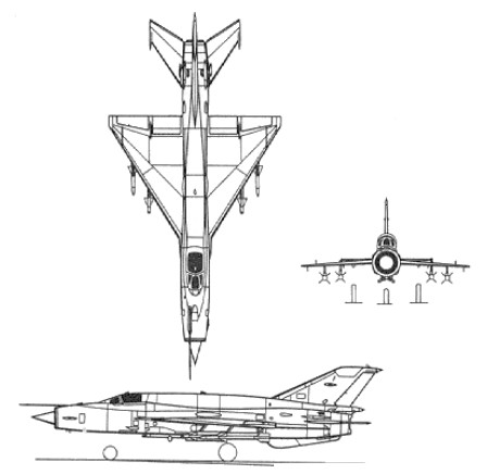 MiG-21bisF Fishbed N Single seat multi-role fighter Engine: Tumanskii R-25, 16,535 lb / 7500 kg Wingspan: 23 ft 5 in / 7.15m Height: 13 ft 5 in / 4.10 m Wing area: 247.58 sq.m / 23.00 sq.m Empty weight: 22,464 lb / 5200 kg Max TOW: 17,549 lb / 7960 kg Max speed: 1385 mph / 2229 kph / M2.1 at 36.090 ft / 11,000m Iniial rate of climb: 57,900 fpm / 17,675 m/min Service ceiling: 50,030 ft / 15,250m Eange: 721 miles / 1160 km Armament: 1 x 23mm twin barrel cannon Bombload: 4409 lb / 2000 kg