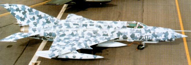 The 1987 final MiG-21bis ‘Fishbed-N’ has the 73.6kN-thrust Tumansky R-25 turbojet and provision for more modern weapons. Indian licence manufacture was scheduled to end early in 1987. Also licence built in China as the Shenyang J-7 types (F-7 for export).