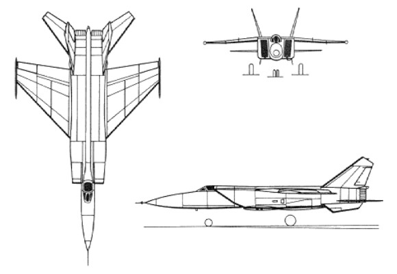 Engine: 1 x R-29B, 120.2kN Wingspan: 8.2-14.3 m / 26 ft 11 in – 46 ft 11 in Length: 16.8 m / 55 ft 1 in Height: 5.5 m / 18 ft 1 in Wing area: 27.3 sq.m / 293.85 sq ft Max take-off weight: 18000 kg / 39683 lb Empty weight: 11000 kg / 24251 lb Max. speed: 2500 km/h / 1553 mph Ceiling: 18600 m / 61000 ft Range w/max.fuel: 3000 km / 1864 miles Range w/max.payload: 960 km / 597 miles Armament: 1 x 23mm cannon, 2000kg of weapons Crew: 1