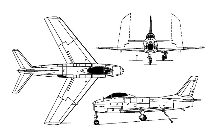 The F-86F had the 35 degrees sweptback wings, with tailplane and elevators linked for co-ordinated movements. Fuel tanks are in the fuselage and two or four underwing jettison able tanks were available.