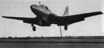 First production aircraft designed by the company, the McDonnell FH-1 Phantom was notable in being also the first jet designed to operate from an aircraft-carrier. The US Navy placed the original letter of intent on 30 August 1943, and the first prototype made its initial flight from St Louis airport, Lambert Field, on 26 January 1945. The type was certainly not over-powered, because the final propulsion system, adopted after many studies of alterna¬tives, was two slim Westinghouse 19B engines buried in the wing roots. Later produced in small numbers as the J30, these were hardly enough for ade¬quate performance.