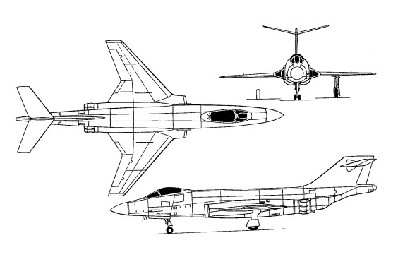The designers set out to produce the smallest possible fighter that would satisfactorily carry a pilot, four 0.50-inch guns and their ammunition for a specified length of time. Weight, wing area and even engine power were treated as secondary consideration. Everything was to be kept as simple as possible with no “frills” or unnecessary gadgets to complicate production. Unorthodox ideas such as a tailless or tail-first layout (to keep the tail out of the way of the jet exhaust) or a prone position for the pilot were quickly put aside.