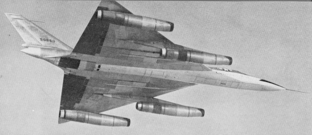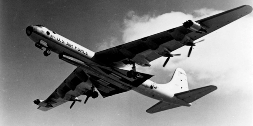 B-36 and XB-58 airframe mating, note the strut assembly joining the two wings together has been removed from the wing’s inboard engine as well as the prop.