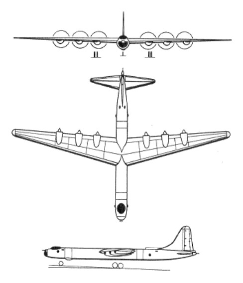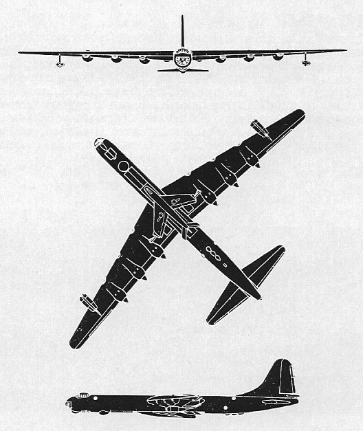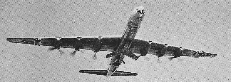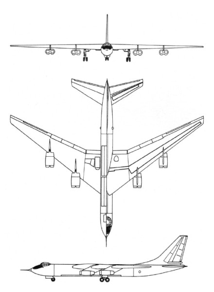 Engines: 8 x 4080kg J57-P-3 Max take-off weight: 300000 kg / 661390 lb Empty weight: 150000 kg / 330695 lb Wingspan: 206 m / 675 ft 10 in Length: 171 m / 561 ft 0 in Height: 50 m / 164 ft 1 in Max. speed: 520 km/h / 323 mph Ceiling: 45000 m / 147650 ft Range: 8000 km / 4971 miles Crew: 10