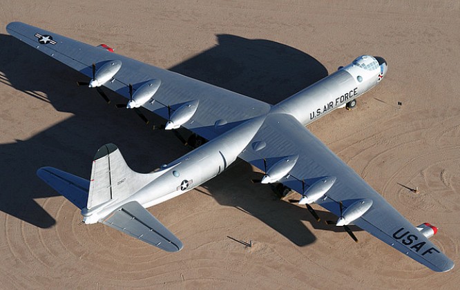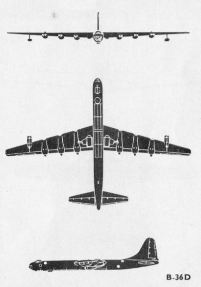GRB-36J Engines: 6 x Pratt & Whitney R-4360-53, 3800 hp & 4 x General Electric J47-GE-19, 5200 lb Wingspan: 230 ft Length: 162 ft 1 in Height: 46 ft 9 in Wing area: 4772 sq.ft Empty weight: 145,000 lb Loaded weight: 408,000 lb Max speed: 436 mph Cruise: P&W eng. Only: 290 mph at 40,000 ft Max range: 10,000 mi
