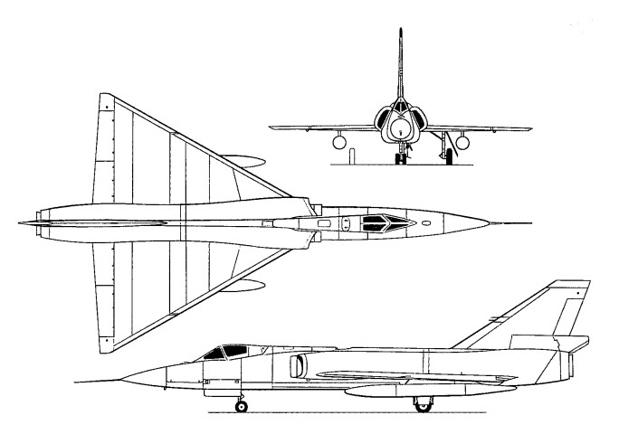The F-106 has mid-set delta wings, with 60 degrees sweepback, no tailplane, and square-top fin and rudder. Engine air intakes are on each side of the fuselage just forward of the wing leading edges.