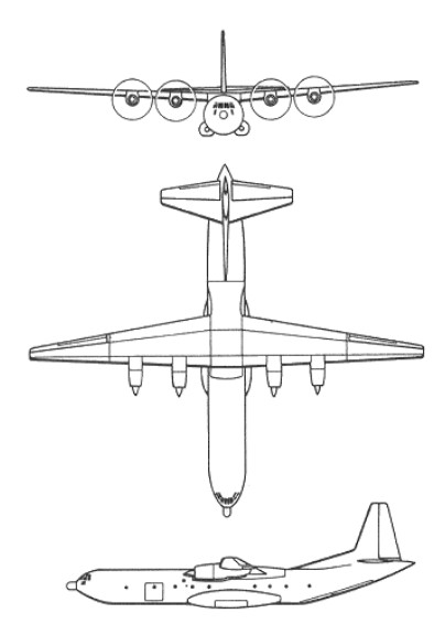 C-133B Engines: 4 x Pratt & Whitney T34-P-9W, 7500 shp / 4410kW Max take-off weight: 129700-136000 kg / 285941 – 299830 lb Empty weight: 54600 kg / 120373 lb Wingspan: 54.8 m / 179 ft 9 in Length: 48.0 m / 157 ft 6 in Height: 14.7 m / 48 ft 3 in Wing area: 248.3 sq.m / 2672.68 sq ft Max. speed: 558 km/h / 347 mph Cruise speed: 500 km/h / 311 mph Ceiling: 6125 m / 20100 ft Range w/max.fuel: 7000 km / 4350 miles Range w/max.payload: 3600 km / 2237 miles Crew: 4 Passengers: 200