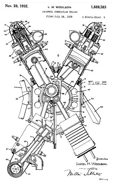The engine was designed by Navy Captain Lionel Melville Woolson, an aeronautical engineer at the Packard Motor Company of Detroit. The engine was an “X” configured design similar to one upright and one inverted V-12 engine mounted on the same crankshaft with a common crankcase. With 5.375 in (136.5 mm) bore and 5 in (130 mm) stroke, the resulting displacement was 2,775 cu in (45.47 l). The engineering involved in the design of the crankshaft, single piece crankcase and the master/slave rod system was very complex.