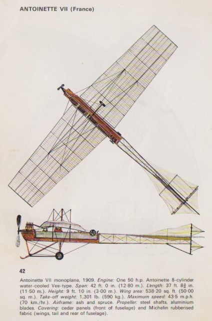 The 1909 Antoinette VIII monoplane was similar to the previous types but the wing span was 46 feet.
