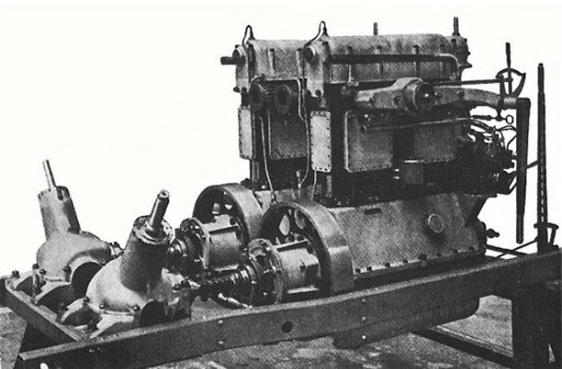 Two of the Fiat S.76 engines mounted side-by-side and set up to drive right-angle gearboxes. They powered a Forlanini F.5 dirigible, used in the war between Italy and Turkey during 1911-1912.