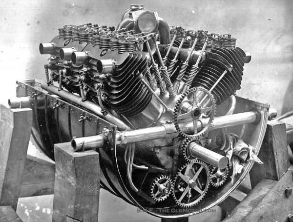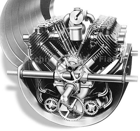 One carburettor feeds all eight cylinders. The ignition for each row of four cylinders is provided by a separate magneto.