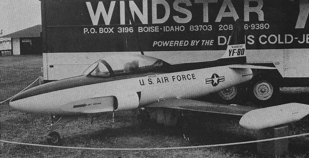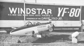 At Oshkosh 1977, Winstar, of Boise, Idaho, showed a half-scale replica of the Lockheed T-33. This small YF-80 is powered by a Davis cold air jet compressed by a compressor producing 220 lb thrust, driven itself by a V8 motor.