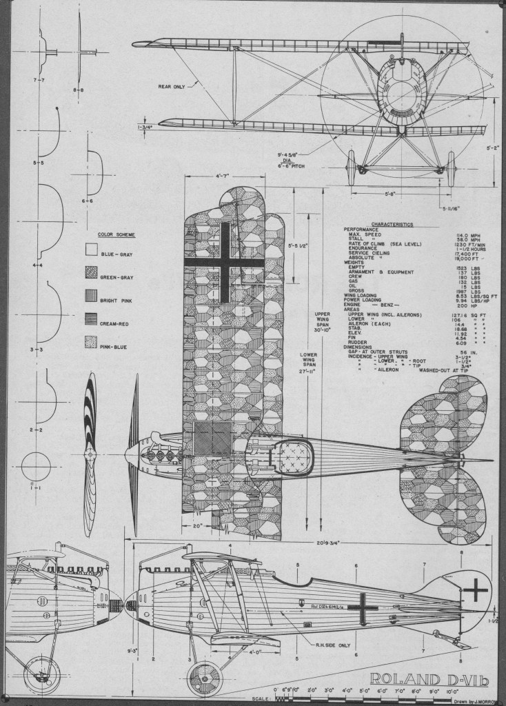 There was little to distinguish the standard production D.VIa from the earlier D.VIb other than the designation lettering on the side of the fuselage and the visible details of the different engines. Early models in each series had the radiator filler cap on the centre line of the upper wing while later models had it at the right side of the radiator. Late V.VI’s and all production S.VIb’s had a diagonal brace wire running from the lower rear wing strut to the upper wing overhang. Late model D.VIb’s were mostly identified by the installation on wider elevators which had aerodynamic balance areas extending forward to the hinge line. Serial numbers were not accurate because many D.VIb’s had earlier serials than late D.VIa’s.