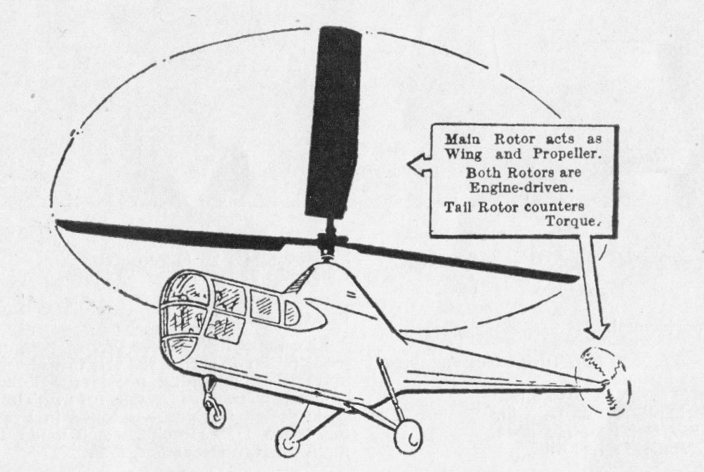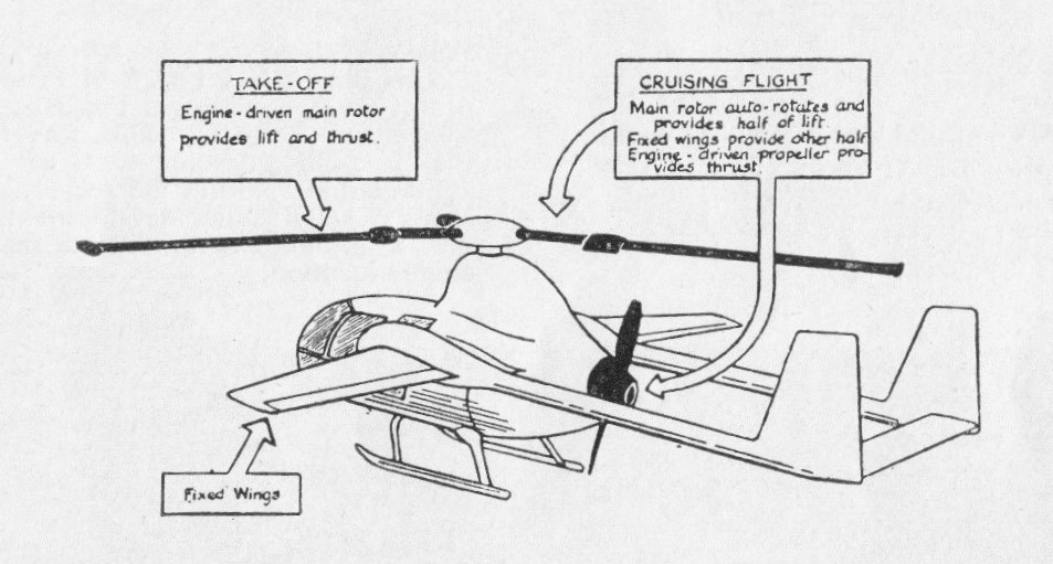 The autogiro has an engine-driven propeller like a fixed-wing aeroplane, and a rotor which is not engine-driven but is purely and simply a rotating wing. In flight the propeller drives the Autogiro forward, while the motion of the air now turns the rotor automatically (known as auto-rotation). As the rotor turns, air passes over its aerofoil shaped blades, developing lift in the same way as the wing of an aeroplane. As long as the Autogiro maintains a forward speed the rotor will develop sufficient lift to keep the machine airborne. If forward speed drops the rotor will still be turned, but lift will be reduced, and the Autogiro will glide to earth.