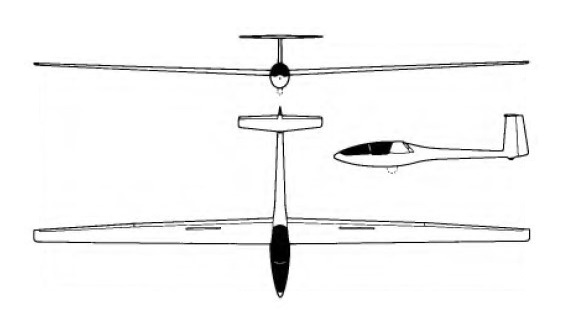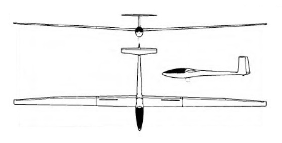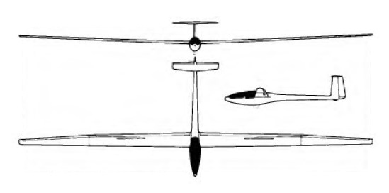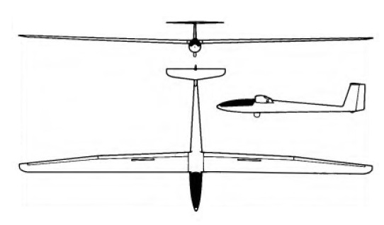 Wing span: 22m / 72 ft 2 in Wing area: 16.26 sq.m / 174.7 sq.ft Length: 7.6 m / 24 ft 11.25 in Height: 1.67 m / 5 ft 5.75 in Empty Weight: 420 kg / 926lb Payload: 180 kg / 397 lb Gross Weight: 600 kg / 1230 lb Wing Load: 36.9 kg/sq.m / 7.57 lb/sq.ft Water Ballast: 0 kg / 0 lb Max speed: 135 kt / 250 km/h / 155mph (smooth air) Stalling speed: 34.5 kt / 64 km/h L/DMax: 49 at 98 kph / 53 kt / 61 mph MinSink: 0.50 m/s / 1.64 fps / 0.97 kt at 45mph / 39 kt / 72 km/h Aspect ratio: 29.8 Airfoil: Wortmann FX-67-K-170/150 Seats 1 No. Built 10