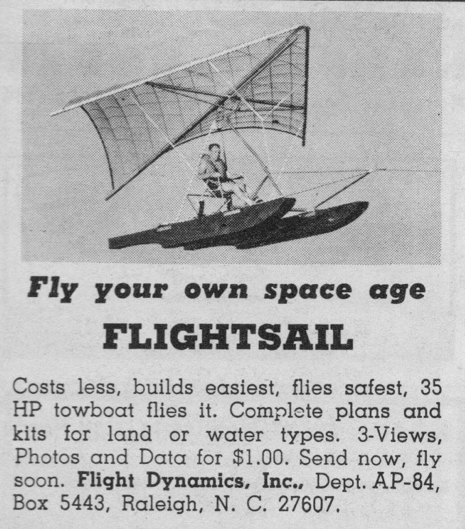 This single- or two-seat homebuilt glider is distinguished by an aerofoil-shaped fuselage and bat-like sailwing type wings, the tail unit being carried on an aluminium boom. It is an unpowered Stage 1 version of an aircraft which, in fully developed powered form, will be known as the Flightsail VII, the Seasprite being of more simplified construction, and it is being marketed as plans to amateur constructors.